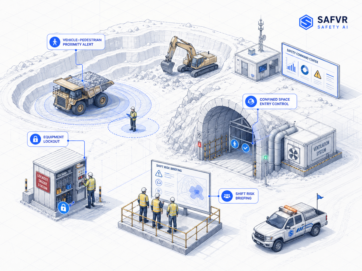 Mining operations span vast areas with extreme hazard profiles — from haul road vehicle interactions to blast zone enforcement to dust and fatigue exposure. SAFVR's AURA engine provides unified safety intelligence across the entire mine-to-plant chain, detecting hazards in real time, automating safety workflows, training crews on site-specific protocols, and predicting where risk is accumulating across shifts.