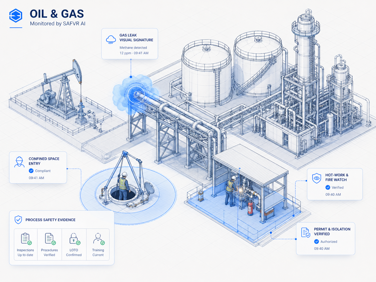Oil & gas operations combine the highest hazard profiles with the most complex regulatory environments. Remote locations, rotating contractors, and overlapping compliance jurisdictions create compounding risk. SAFVR's AURA engine provides unified safety intelligence across distributed sites — detecting hazards in real time, automating permit and compliance workflows, training contractors on site-specific protocols, and predicting where risk is accumulating.